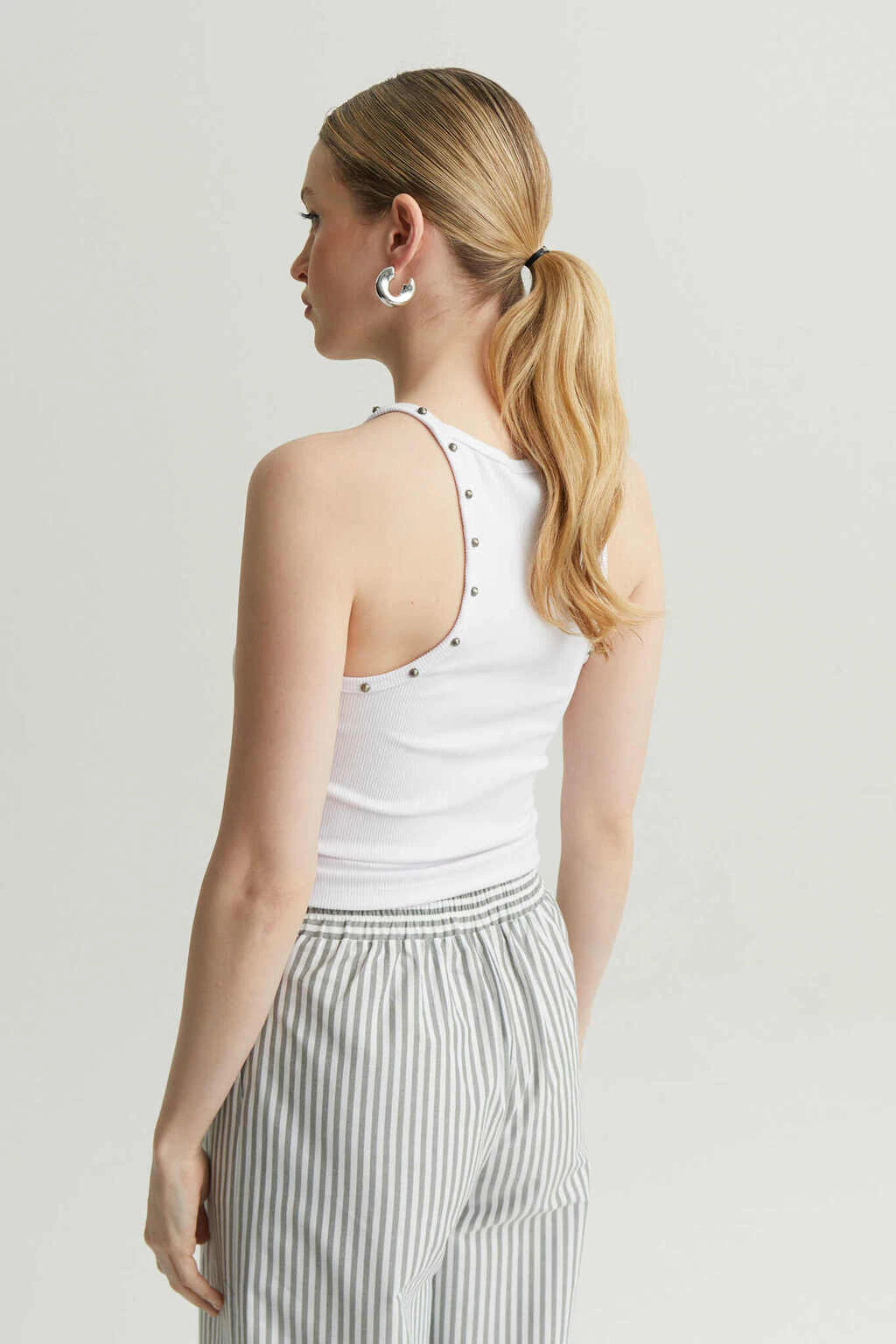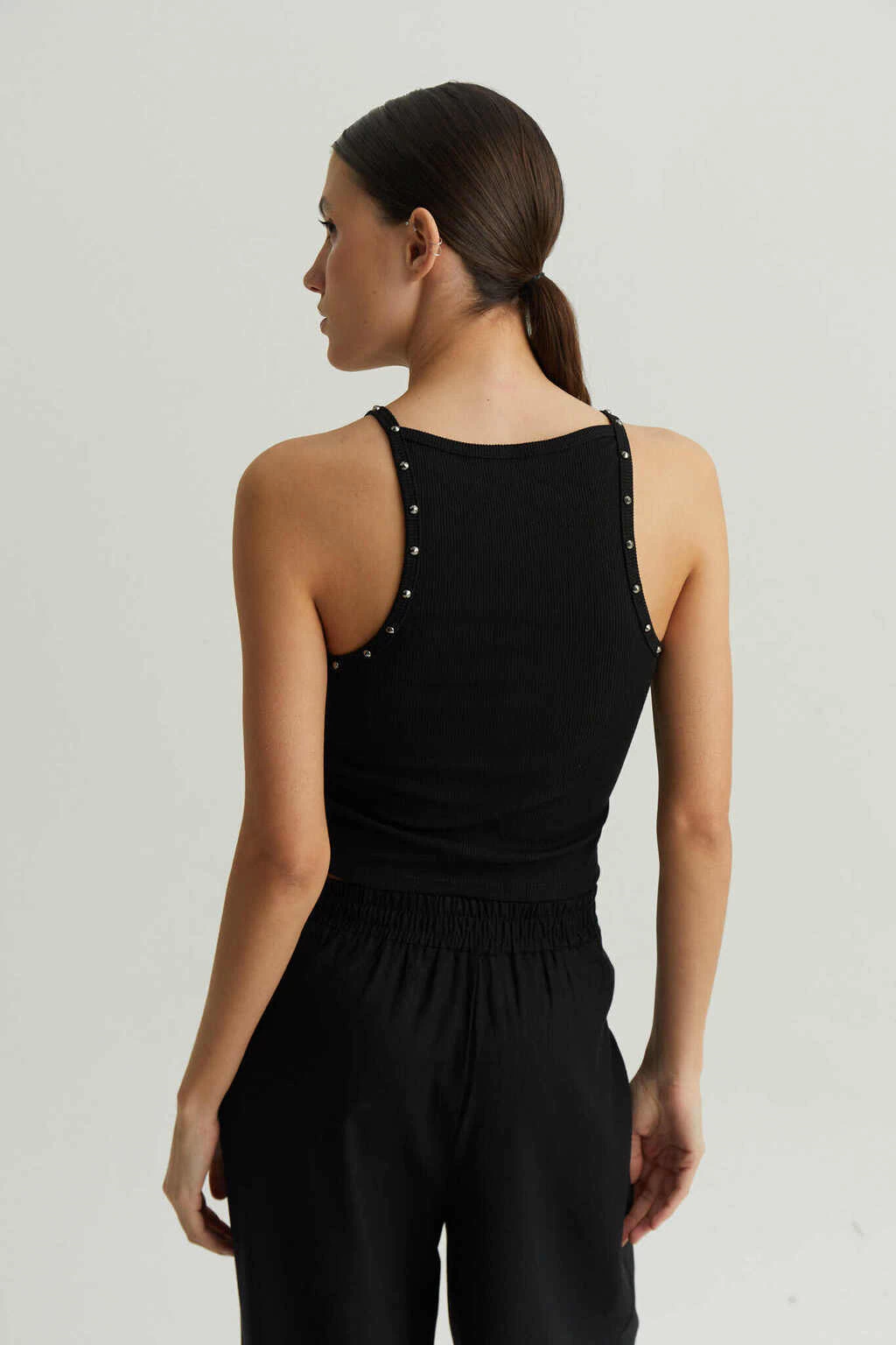 Su diseño se adorna con tachas en el escote y las sisas, aportando un toque moderno y atrevido. Confeccionada en una mezcla de 95% poliéster y 5% elastano, garantiza un calce ideal y una gran libertad de movimiento.